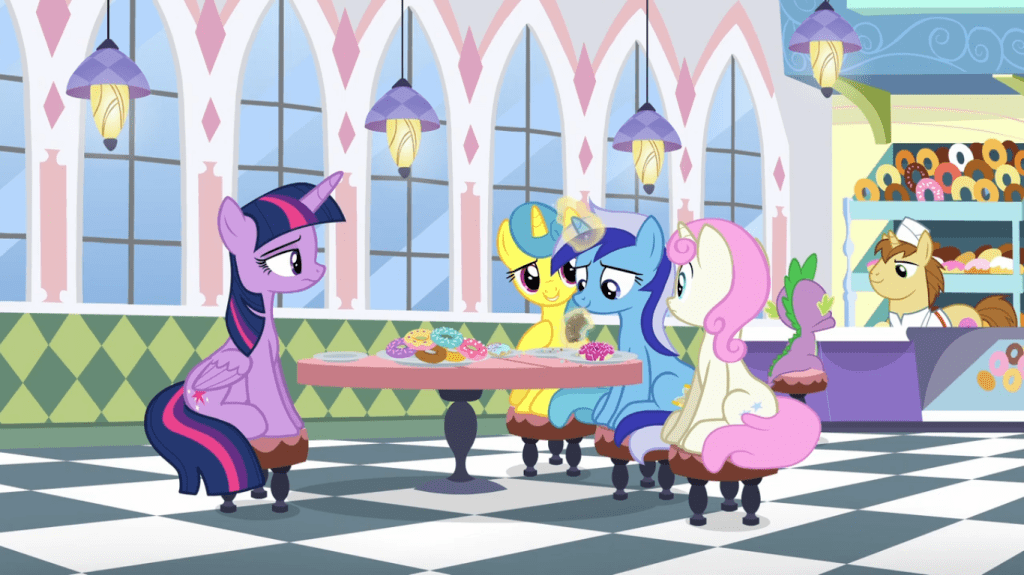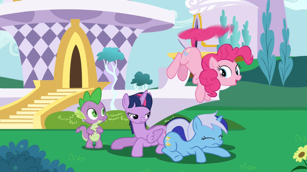 As much as Twilight Sparkle has learned about friendship since she moved to Ponyville, she still easily gets blindsided by two ponies turning out to already be friends. Minuette did say she visits Ponyville regularly, and we know Pinkie Pie has an extensive knowledge of everyone in the town. Plus, their personalities are really similar. But I find that Twilight’s presumption that the two didn’t already know each other shows how endearingly imperfect she is. Pinkie Pie even says that Minuette was a bridesmaid at Cadance’s wedding, and jabs at Twilight Sparkle for not knowing they were friends. I can kind of see it though: once Twilight Sparkle fell out of touch with her Canterlot friends, she started thinking they were out doing their own things far away from her, when they were regular visitors of Ponyville all along.