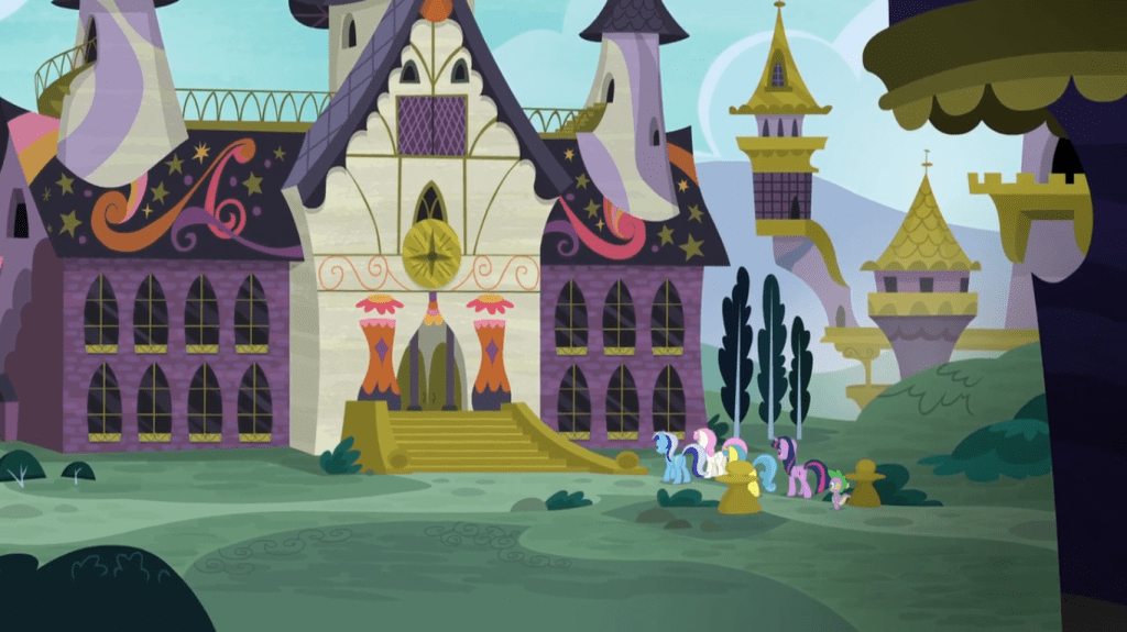 One thing this episode has in common with Slice of Life is that it leans on the fourth wall at times. An example is when Twilight Sparkle says to start at the beginning, referring to her old house in Canterlot. While this is obviously a reference to where the show began, I’d also like to think of it in in-universe terms. The day Twilight Sparkle moved to Ponyville is clearly an important day for her, because it started the current chapter of her life. Although her first onscreen moment in the show was right outside this castle, the day presumably started with her waking up inside it.