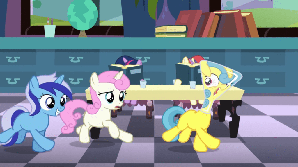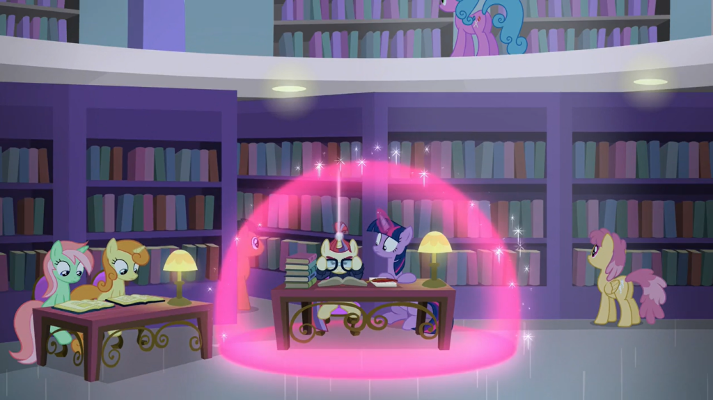 Note the contrast between Moondancer and the rest of the ponies at the library. While most ponies are having a good time picking out books and studying with friends, Moondancer is all alone and refuses to talk to anyone. I imagine that she usually goes to the library when she’s nauseous from sitting at home too long, and then goes back home when she’s nauseous from the library.