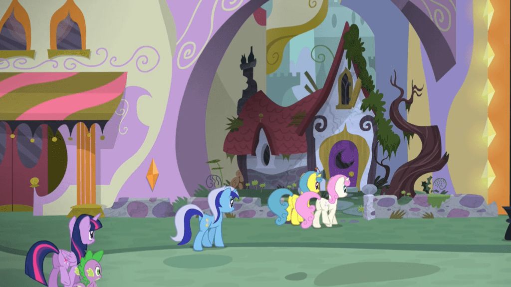 Twilight Sparkle and Spike find that everything in their old house is exactly as they left it, which is a huge nostalgia trip for them and the viewers. How has no one moved into this place when it’s been abandoned for at least a year? Is Canterlot going through an economic decline that is making abandoned houses commonplace? Or does no one feel it’s right to move into the former home of a princess? Maybe the place is still legally owned by either Twilight or Celestia.