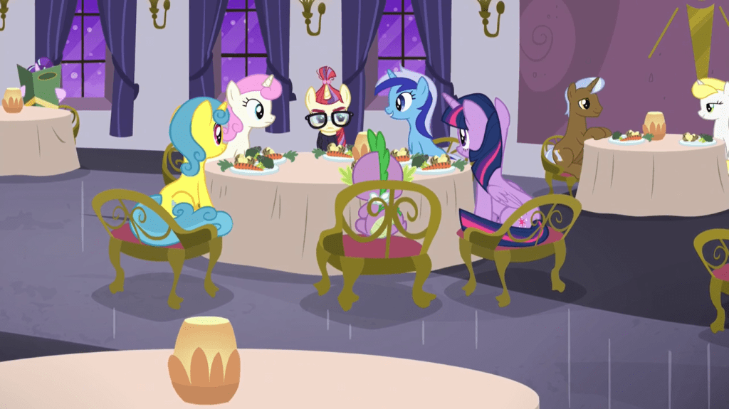 While Moondancer was eager to talk to Twilight Sparkle about their shared passion for magic spells, at the dinner with the others, she’s back to being grumpy and curt. The other ponies have varying reactions to this: while Minuette tries to keep good spirits, Twinkleshine and Lemon Hearts are openly awkward and struggle to make conversation.