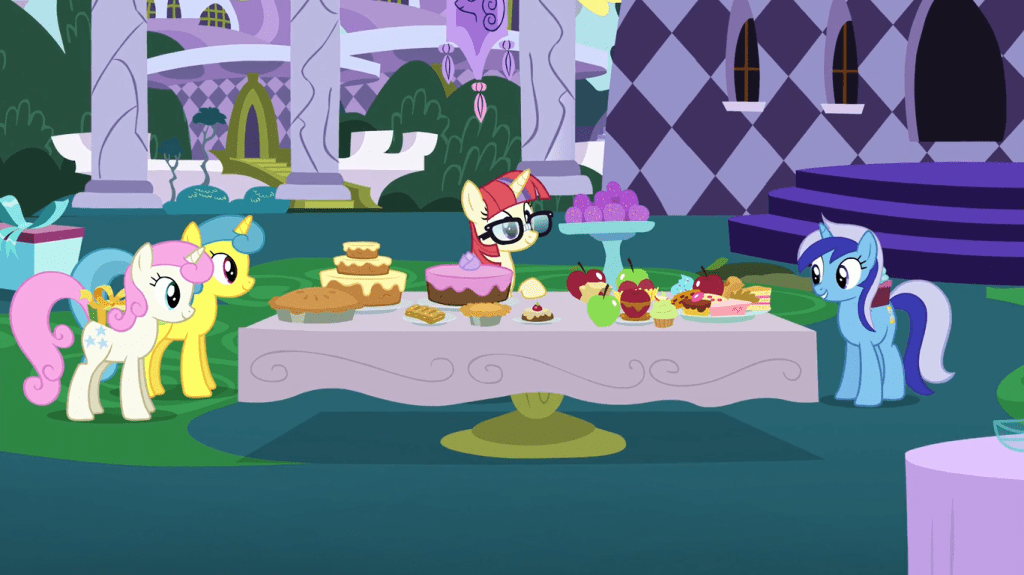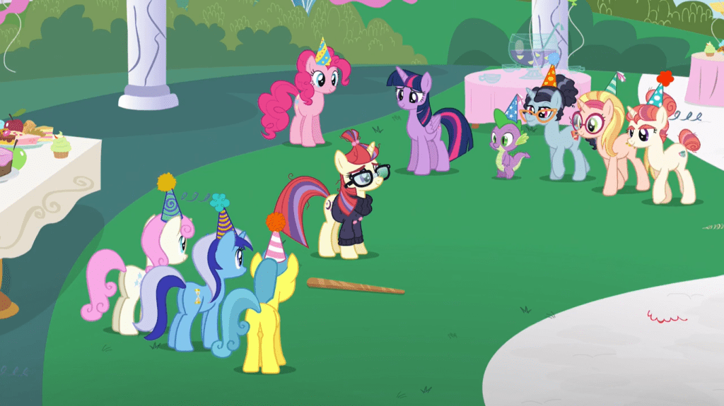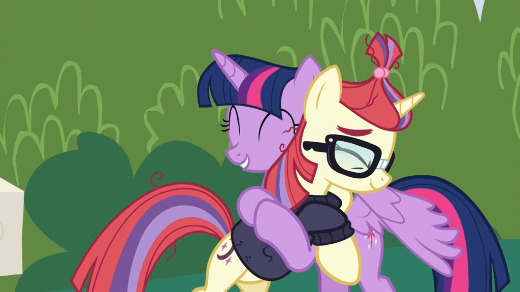 Sometimes in life, you need to let out all your frustration and tears in one dramatic tirade, or else you’ll never move on from what you’re mad about, and the person you’re mad at won’t realize their mistakes. Twilight Sparkle owns up to her wrongdoings here and tells Moondancer that this shouldn’t prevent her from being friends with anyone else. But since she knows Moondancer would have trouble finding new friends, she saves Moondancer some trouble and brings over some ponies to the party: Moondancer’s librarian, her book seller, and her sister. Just like how Celestia paved the way for Twilight to befriend the rest of the Mane 6, Twilight is doing something similar with Moondancer.