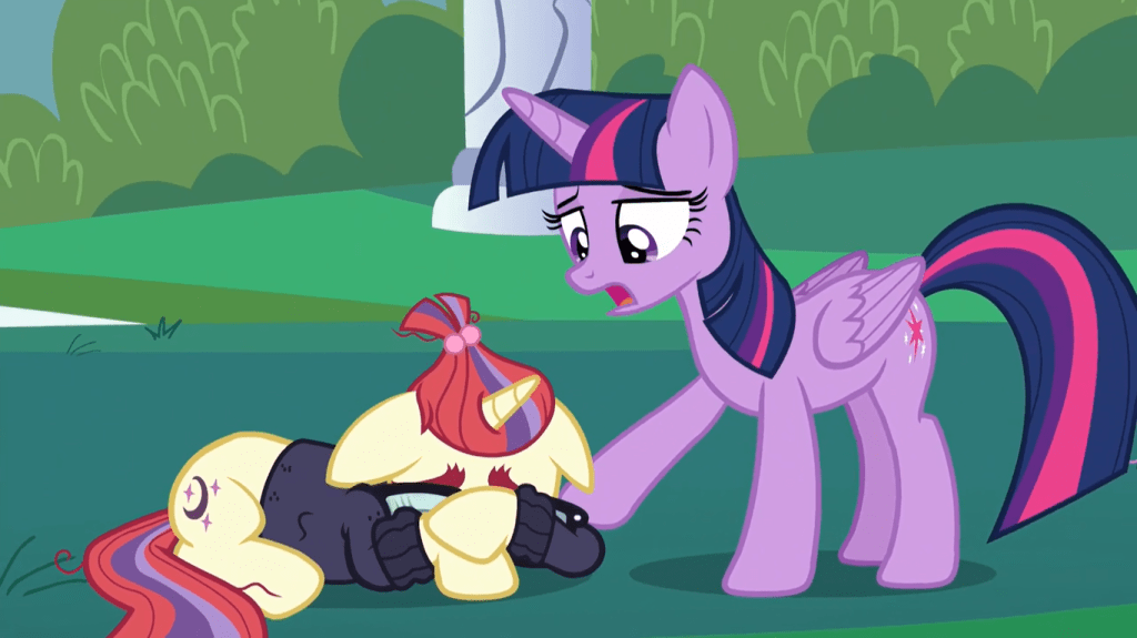Twilight Sparkle eventually gets Moondancer to talk to her by entering the pages of her book with magic. What’s the most interesting part of this scene? Why, it’s obviously that Moondancer accidentally calls her “Twilight Twinkle”! Now, you might think I’m going to talk at length about how Twilight Sparkle was going to be called Twilight Twinkle, but that’s just obvious trivia. While this misnaming was probably just intended as a nod to the show’s development, Moondancer’s usage of the word “twinkle” suggests that she also remembers Twinkleshine and the others deep down—it’s just been so long since she saw them that her memories are scrambled.