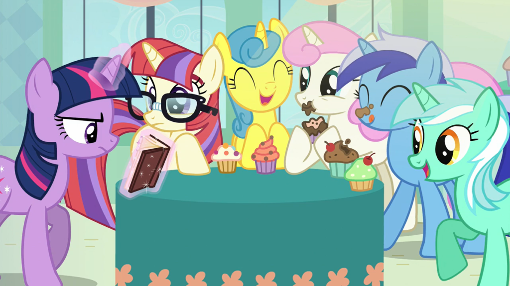 Twilight Sparkle gives a melodramatic, clearly rehearsed apology speech about neglecting her friendship with the three ponies she’s sitting with, but they all laugh and easily forgive her. I can tell that for them, the joy of hanging out with their nerdy purple buddy again outweighs any sadness from her scampering off to Ponyville. I’d probably react the same if I was in their situation—or at least, I’d like to think so.