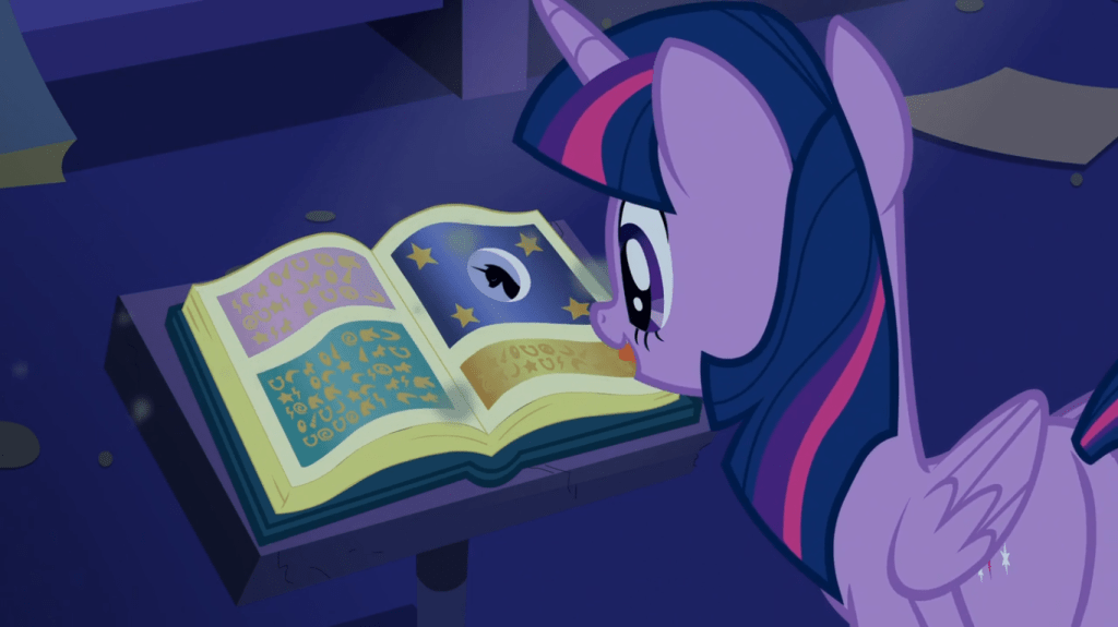 Twilight Sparkle: (blows dust off) Look! It’s Predictions and Prophecies. And it’s still open to the Elements of Harmony!