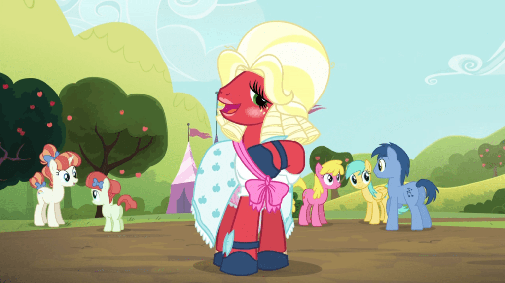 … she’s joined by Big Macintosh, who pretends to be her nonexistent second cousin named Orchard Blossom. His pretend-mare act is divisive among fans, especially those in the LGBT community: some find it a humorous homage to drag queens, while others find it so creepy that it ruins the whole episode for them. I personally find the act both humorous and insightful into Big Mac’s character. It shows that he’s perfectly capable of speaking in lengthy sentences, but just chooses not to most of the time. This is further cemented when we see his younger self in Where the Apple Lies, as well as when he gets more talkative in seasons 7-9.