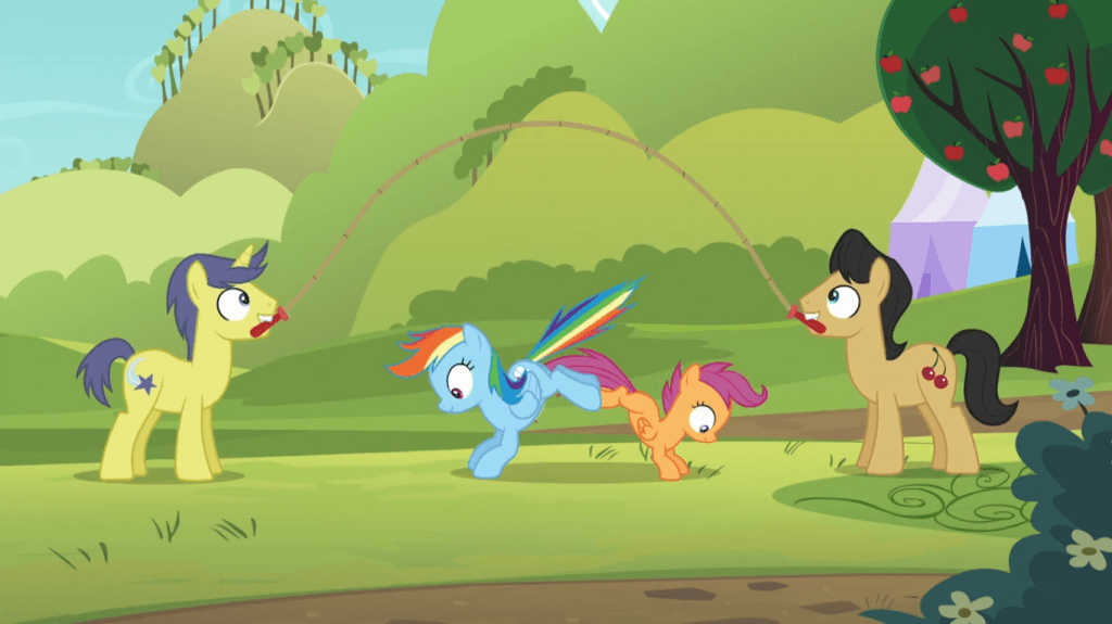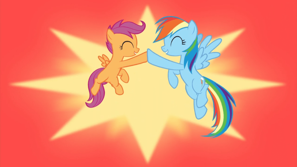 Since it’s not the primary focus of this episode, Scootaloo and Rainbow Dash’s sisterly relationship gets a very nice victory lap here. Sweetie Belle remains a spectator through the event, and as for Apple Bloom…