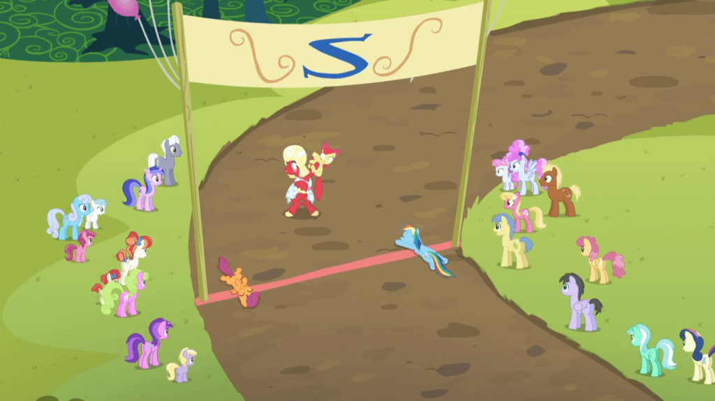 Apple Bloom and Big Macintosh beat Rainbow Dash and Scootaloo to the finish line at the last second, then Big Macintosh’s cover is blown—not that any of the judges had fallen for it.