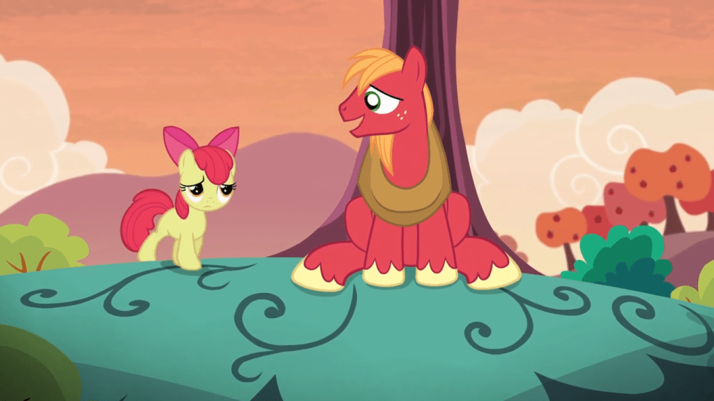 There’s Apple Bloom’s childish way of thinking again: her brain filtered out the word “maybe” because she was so stoked about the Sisterhooves Social. She won’t accept the unfortunate truth until it hits her in the face, and when it does, she’s devastated. Finding herself in a mediator role typical of middle siblings, Applejack asks Big Macintosh to cheer Apple Bloom up some.