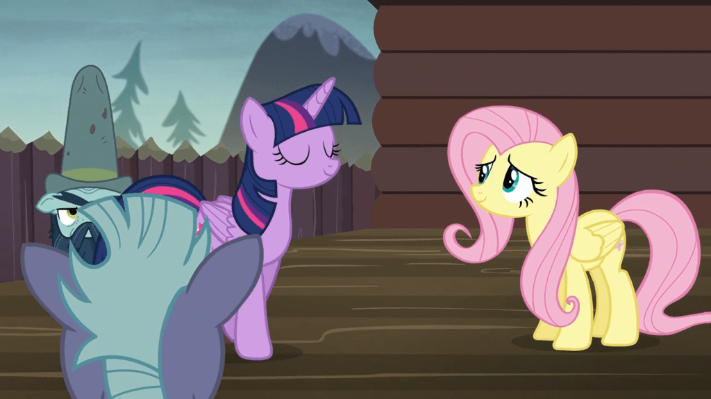 Though Twilight Sparkle is typically the “straight man” (yes, I know, that isn’t a very gender-neutral term) among the Mane 6’s antics, when she’s paired up with Fluttershy, the roles are reversed. This is good because I enjoy Fluttershy’s snarky side very much.