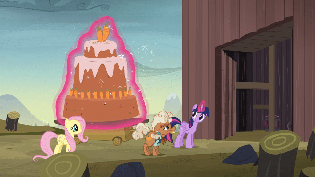 Twilight Sparkle convinces the Hooffields to send the McColts an apology cake, except it turns out to be a Trojan horse and the brawl continues. This fakeout feels pretty obvious, but that’s mostly because it’s just over halfway through the episode.