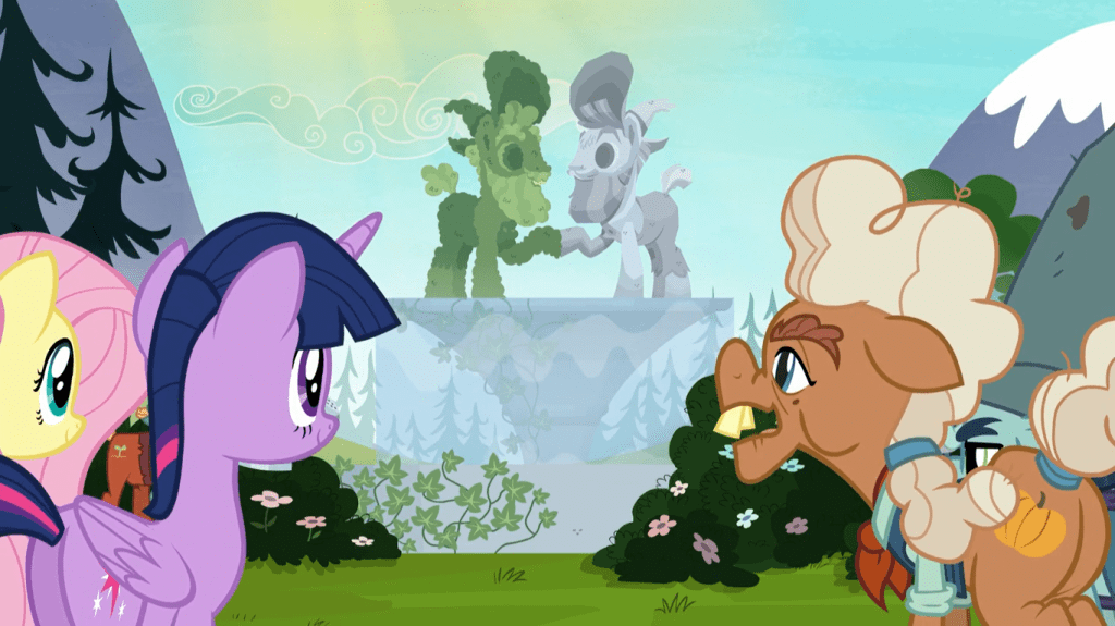 The ancestors of the Hooffields and McColts get statues in their honor, or rather, one statue and one piece of plant artwork. These things normally take quite a while to make, so I’m going to guess that Twilight Sparkle sped up the process with magic spells. It’s much like how Rarity used magic to make some art out of plants in Look Before You Sleep, and if you’re wondering why I remember something so small, it’s because I am reviewing every episode of the show in meticulous detail. Bet you didn’t know that, did you?