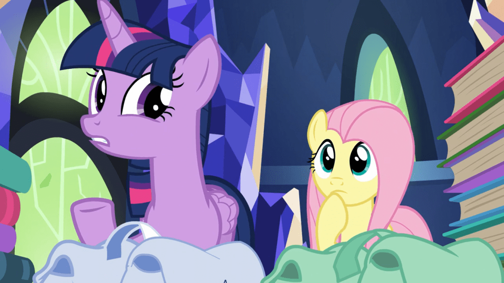 Twilight Sparkle easily carries her bags while walking merrily, but to Fluttershy, they feel like bags of lead. I wonder where this difference arises from? Do alicorns have earth pony strength in addition to flight and magic? Or did Twilight Sparkle research magic spells within the last five minutes to decrease the weight of objects she’s carrying? The second explanation is much funnier, so I’ll go with that.