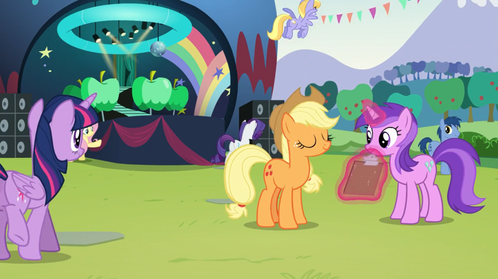 The last regular episode of season 5 starts with the Mane 6 working together to organize a concert for Ponyville’s Helping Hooves Music Festival. Applejack claims it was easy because setting up a concert is a lot like setting up a rodeo. This season almost went by without having a pure Applejack episode, but now it has one after all.