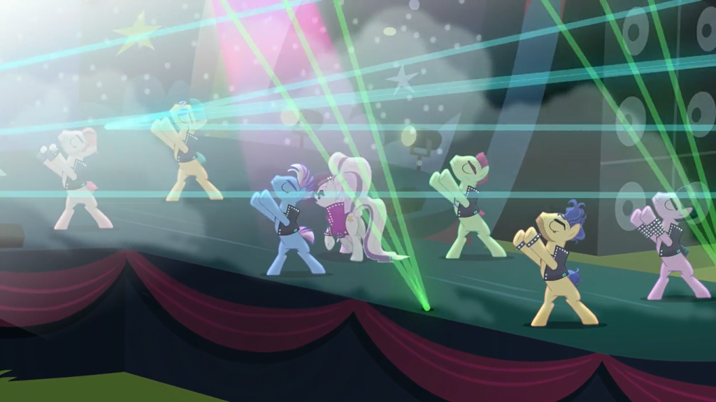 As a rehearsal, Countess Coloratura performs a dance song unlike anything else we’ve heard in the show before called “The Spectacle”. As someone who’s not into this gaudy modern flavor of electronic music, filled with flashy effects and barely intelligible lyrics, I think this is an on-point imitation (or rather, ponification) of such music. Unfortunately, a lot of fans didn’t get that this was supposed to be a parody of this genre, and I can think of two reasons why. The first is because (sigh) Equestria Girls had to fucking happen, and fans were thus exposed to musical numbers of this kind that were genuinely meant to be cool and stunning. The second reason couldn’t have been prevented: this genre of music has become enormously popular in the 2010s, because you can’t deny that songs like this are catchy and sell extremely well. The show knows how to do a purposely bad musical number, which it did back in The Show Stoppers. But many fans dislike the episode because of the ear-grating singing, and even then, “bad on purpose” is difficult to achieve in such a genuinely good work of media.