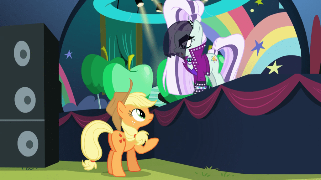 Applejack convinces Coloratura to pretend she wants to cancel the school pony part of the event, so she can see Svengallop’s true side. In this scene, there’s some symbolism to be taken in Coloratura standing high above Applejack. She’s up top and has everything she ever wanted… or does she?