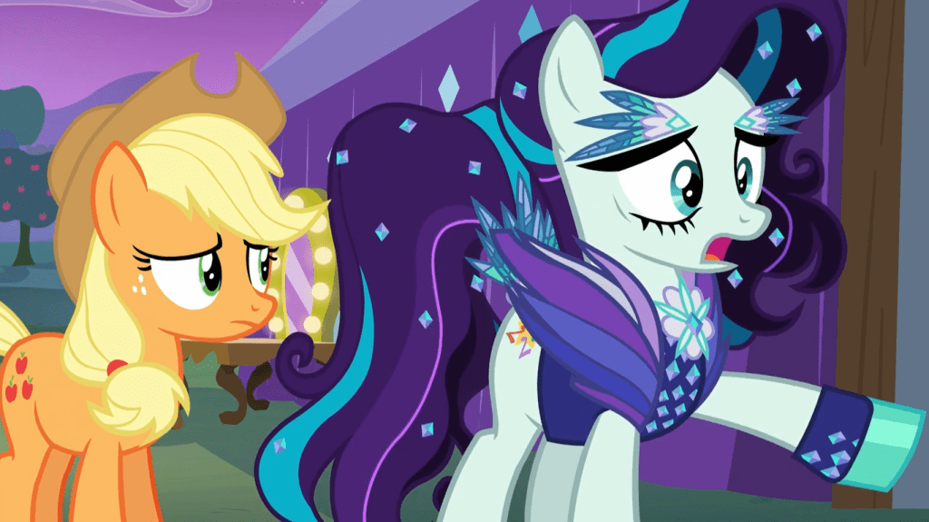 Applejack learns they’re the same pony after all when she sees Coloratura’s cutie mark, but she still thinks there’s a misunderstanding.