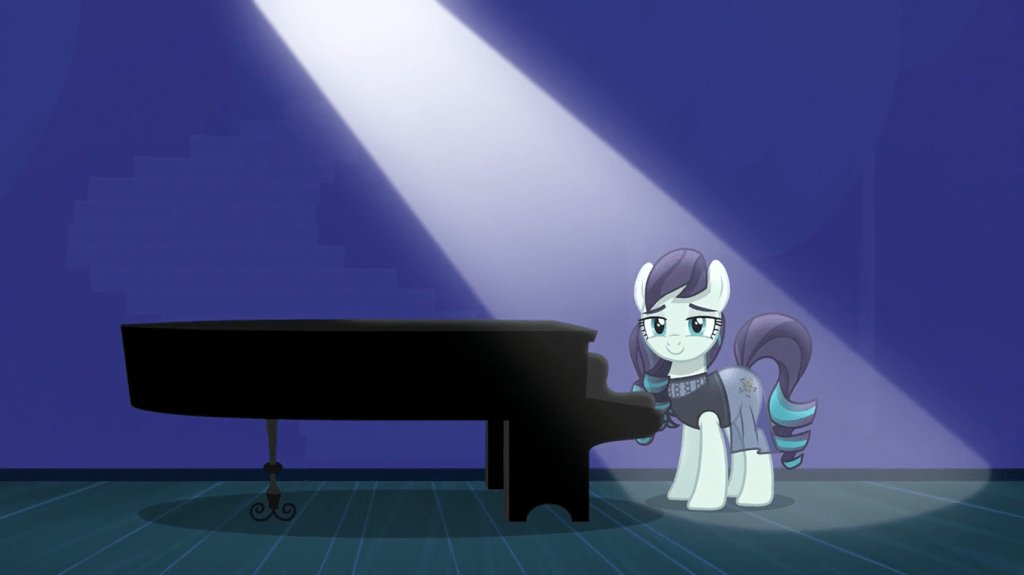 This is a good time to discuss a criticism with this part of the episode. Some people think that this episode glorifies one genre of music (emotional piano ballads) while denigrating another (dance pop music) as soulless garbage. But you should remember that Coloratura is just one pony. It’s perfectly possible that for some people, this flavor of pop music is their way of being true to themselves; for Coloratura, it’s merely something she was pushed into for the sake of money.