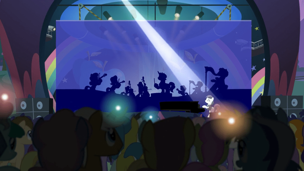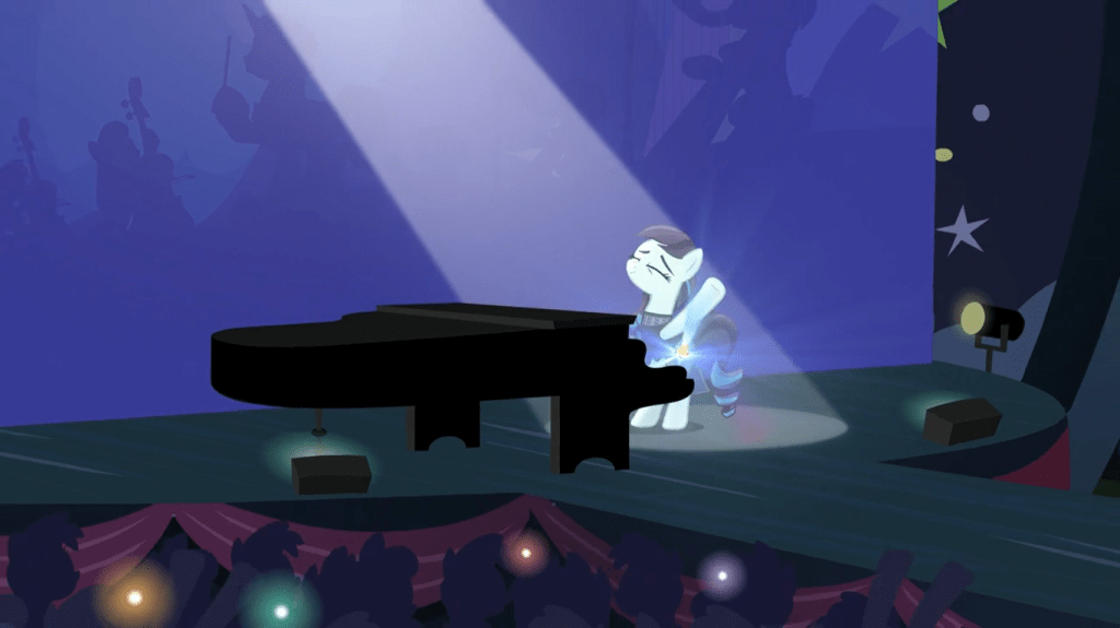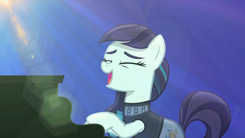The chorus is another point of contrast against The Spectacle, whose lyrics ended with “not just a pony, I am the Countess”. When you’re a fan of such a popular artist, it’s notoriously easy to forget they’re still a regular human with feelings, and Coloratura finds it important to remind all her friends of the same. The lyric “true” is followed by another “oh oh oh oh” moving between notes, but this time with her natural voice, proving the autotune in her previous song was unnecessary. After that line is repeated, she ends with “just like the magic inside of you” and moves to the second verse.