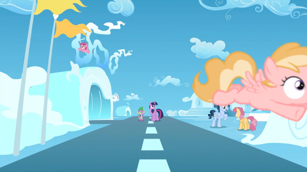 And so, Twilight Sparkle and Spike are sent back to the past—specifically, in Cloudsdale on the Mane 6’s fateful day. There’s not much dilly-dallying with gags like “haha, he looks so dorky as a kid” or “wait, is that seriously her?” because there doesn’t need to be—the exciting, jarring effect of characters time traveling is there either way. We’ve watched this scene before, and we’ll revisit it multiple times throughout this season finale.