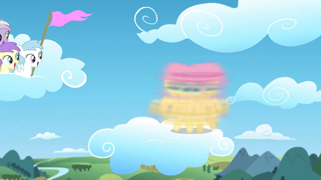 The speech itself starts off as a recap of cutie mark lore, attended by a bunch of familiar faces, and… wait just a minute, Twilight Sparkle. That is not how Venn diagrams work! The intersections between two circles show common traits between whichever entities the circles represent. If you are to read this diagram logically, it tells us that Sweetie Belle has both her own cutie mark and Scootaloo’s, Scootaloo has hers and Apple Bloom’s, and Apple Bloom has hers and Sweetie Belle’s. The only correct part of this diagram is the tricolored shield in the center, which is something that all three Cutie Mark Crusaders’ marks share.