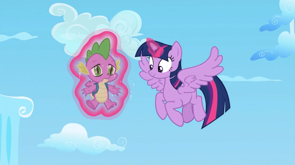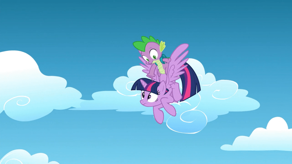 In this scene, Twilight keeps having to rescue Spike from falling.