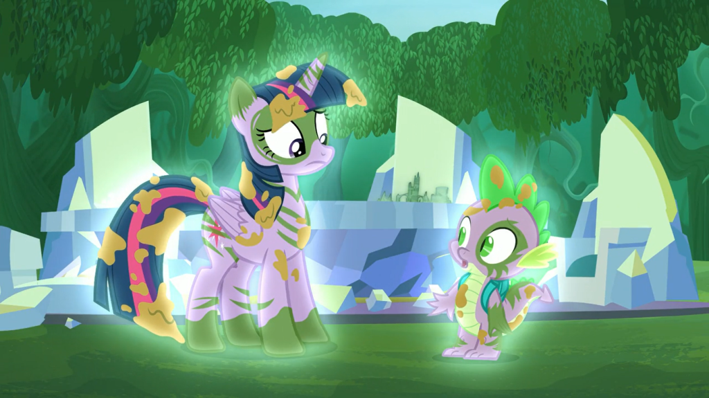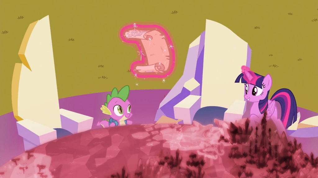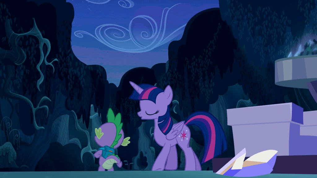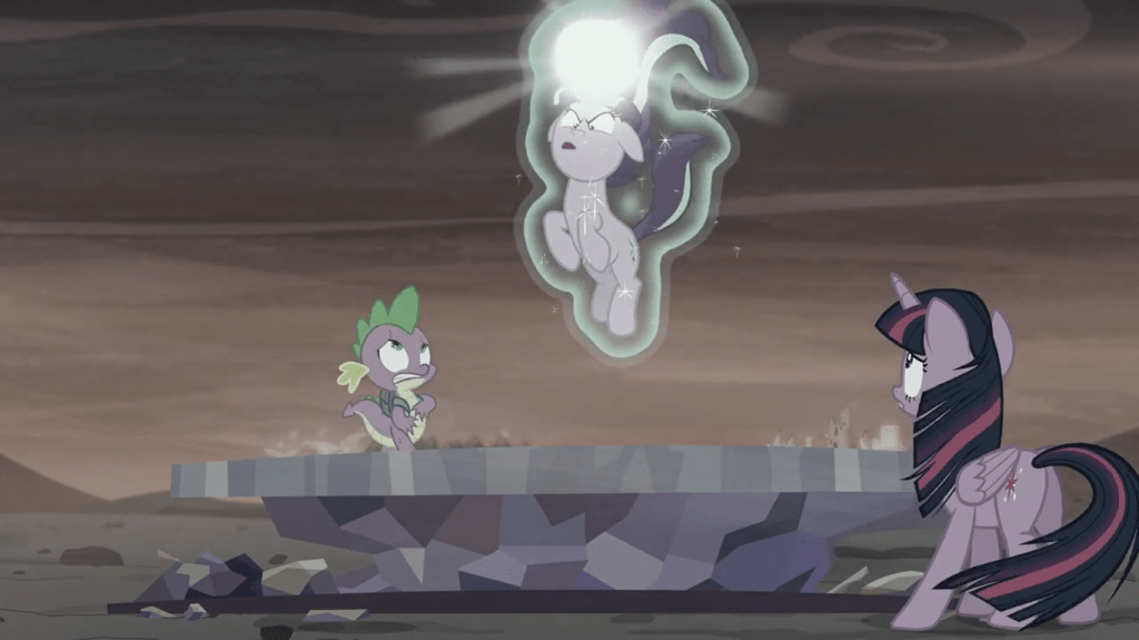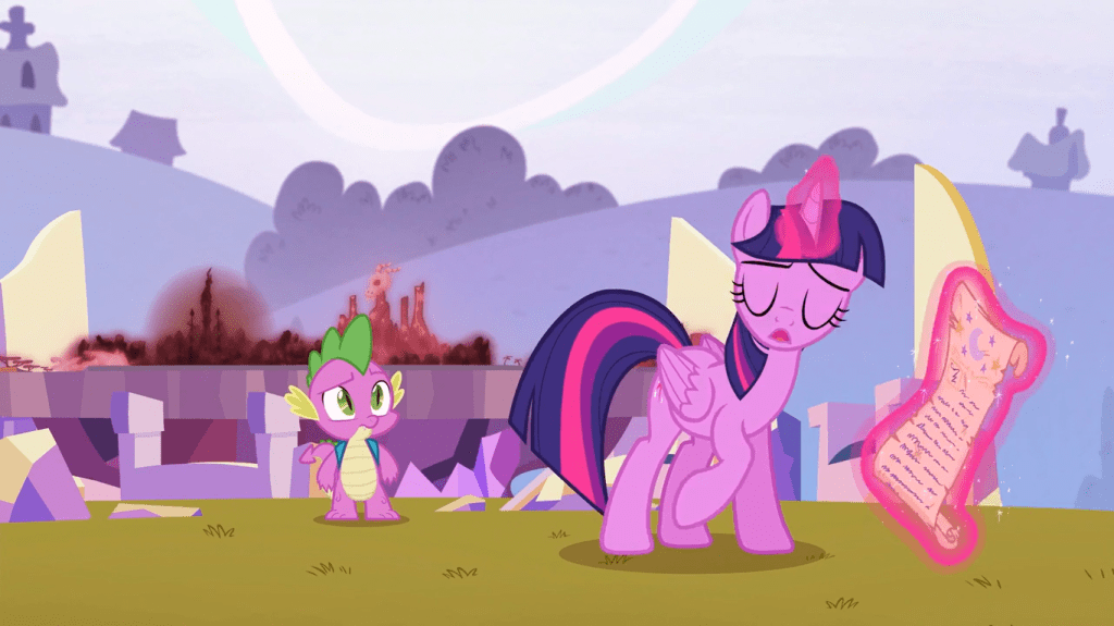 This dramatic two-part episode starts off as innocuous as any season finale would: with Twilight Sparkle rehearsing a speech to Celestia’s School for Gifted Unicorns, while Spike jabs at her for perfectionism. As you should already know, this is all part of the setup.