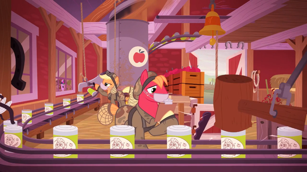 … except for Sweet Apple Acres, which has transformed into a gritty factory. It looks to me like the farm has been repurposed to send off rationed food to all the soldiers abroad. The cans are all branded with Granny Smith’s face—perhaps in this timeline, she’s a fallen rebel of Ponyville, a symbol of the resistance.