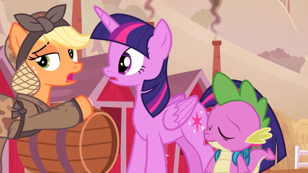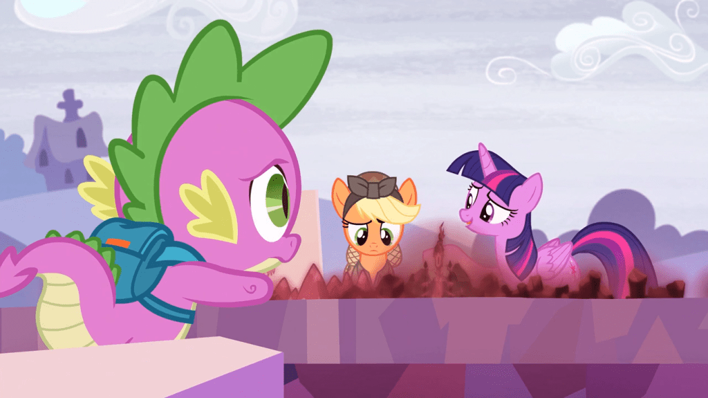 I wonder why Applejack isn’t more surprised to see an alicorn she’s never met PLUS a young dragon? As I said earlier, it’s likely that ponies and dragons have zero contact in this timeline. Maybe Applejack has more important things to worry about and doesn’t want to waste time getting shocked at silly things. Or maybe it just doesn’t occur to the show’s writers for a character to say “wait, you’re an alicorn?!” every time.