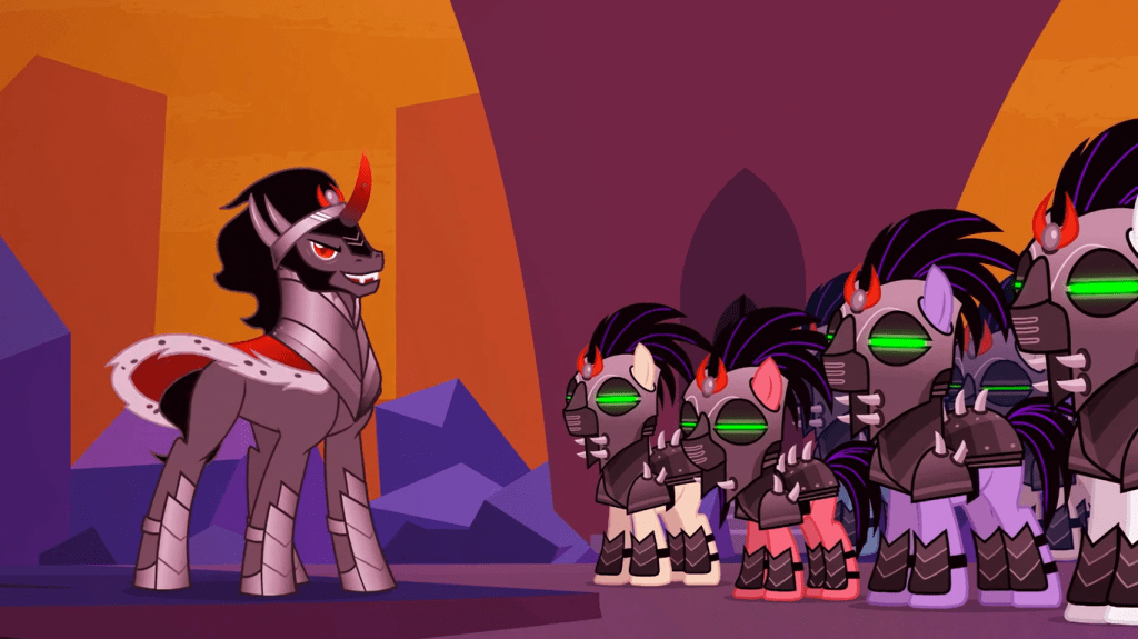 Applejack reveals that when the Crystal Empire returned, King Sombra assembled an army out of the crystal ponies to fight for him against Equestria. This makes sense, because there was no Mane 6 to distract the crystal ponies and keep them out of their trauma, or rescue the crystal heart and do all that other stuff. It makes me wonder though… if King Sombra was the first villain to succeed in this timeline, then what happened with the other three? I have a few theories, which I’ll write without saying “maybe” or “presumably” or “I imagine that”.