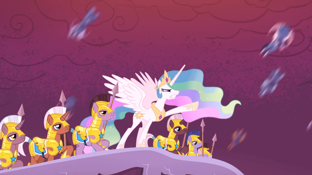 In the regular timeline, Celestia served as a mentor to Twilight Sparkle and her friends, giving them instructions because she knew they’d be able to defeat all the villains they faced. But here, Celestia is taking charge on her own, since all her prophecies about six ponies defeating villain after villain turned out to be lies. It’s admirable to see, and upsetting considering Luna is not by her side.