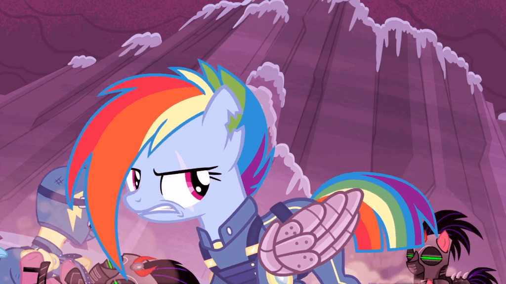 It’s subtly heartwarming that the Mane 6 are still working together in the resistance, just that they don’t know each other’s names. We see Fluttershy shaving some sheep, whose wool Rarity uses to make resilient battle outfits. The only Mane 6 member not seen in these timelines is Twilight Sparkle, perhaps so that viewers aren’t confused. I think the absence of alternate Twilights suggests that in every one of these timelines, she remained a reclusive shut-in.