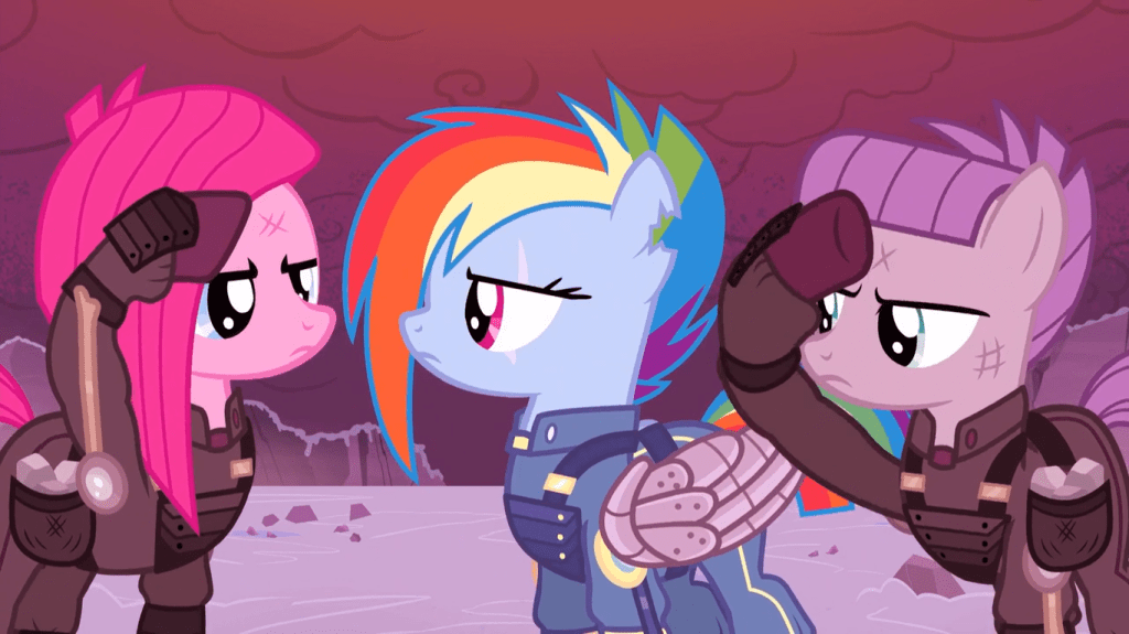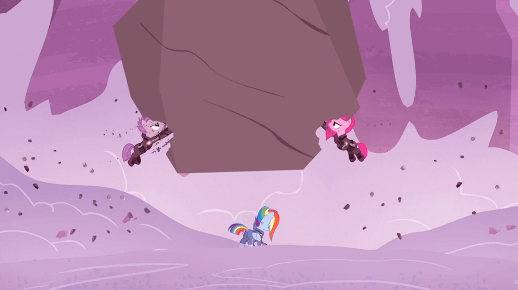 This scene is absolutely insane too. Pinkie Pie and Maud Pie drill a rock apart together to save Rainbow Dash and getting crushed, then they salute her in a slight trace of the Mane 6’s strong friendships we know and love. It’s worth noting that we don’t see any of the Mane 6’s cutie marks in this timeline. In Pinkie Pie’s case, this is especially logical because it wouldn’t make sense for this version of her to have a balloon cutie mark, but it would raise the WILDEST implications about cutie mark lore if we saw alternate timelines give alternate cutie marks and completely distract from the point of this episode.