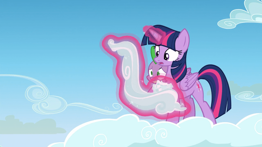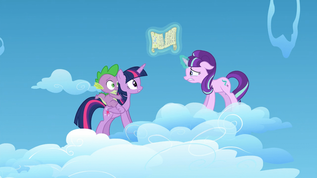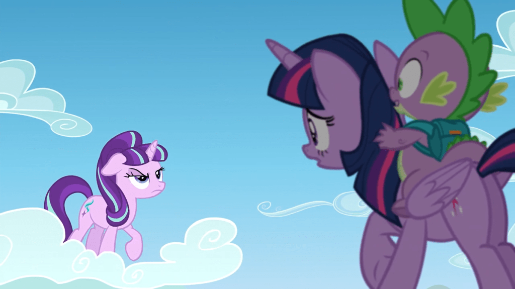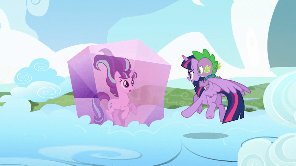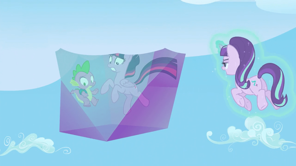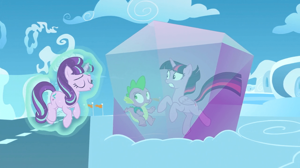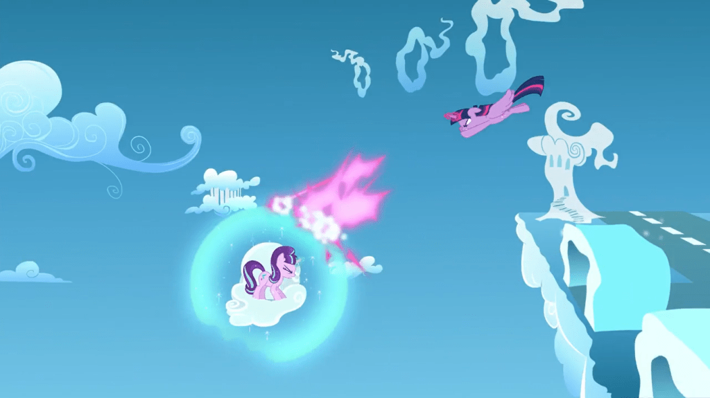 Twilight Sparkle escapes the crystal with magic but forgets about Spike, and I don’t know if it’s OK that I find Spike screaming “TWILIGHT!” offscreen mildly funny. She rescues her sidekick from falling, then they go to the clouds so they can stop Starlight from stopping Rainbow Dash’s rainboom…