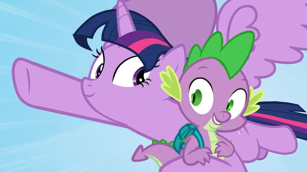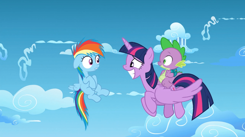 When Fluttershy is knocked off the cloud, Twilight Sparkle instinctively tries to rescue her, and Spike holds her wings back as a reminder not to disrupt the timeline. It’s sweet that Twilight has her friends’ safety in mind, while it’s smart that Spike keeps her from doing something stupid—that’s exactly what a good sidekick does.