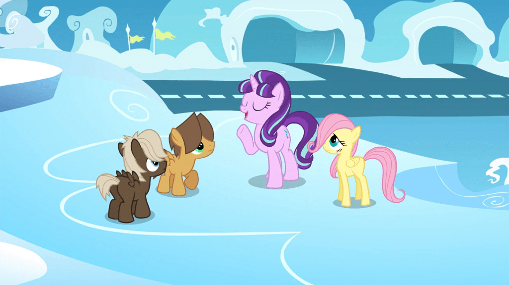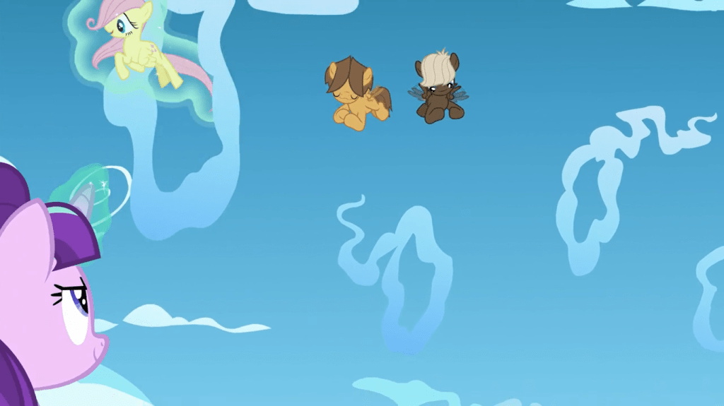 This scene, where Starlight Glimmer helps Fluttershy fly to stop her from getting bullied, is proof that unicorns are overpowered. If there was a powerful enough unicorn at flight camp, then the pegasi could learn to fly much more quickly than with guidance from other pegasi. Now I know most unicorns would fall right through clouds, but Starlight Glimmer can bypass that.