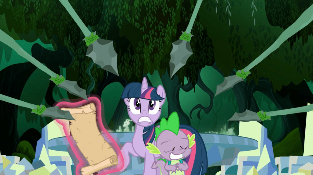 Starlight Glimmer goes on to perform an insanely cool-looking magic spell that sucks her into a mysterious time vortex and is impervious to Twilight’s magic. The spell is powered by the magic of the Cutie Map plus an ancient scroll from Star Swirl the Bearded that Starlight tosses aside once it’s not needed. When Twilight picks up the scroll, she and Spike are sucked into the portal.