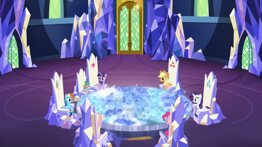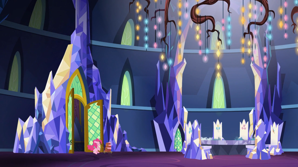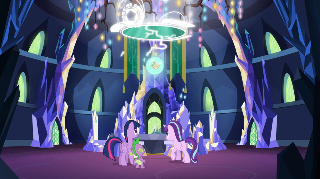 In this timeline, on the thousandth anniversary of Nightmare Moon’s defeat, Moondancer set out on a journey all by herself to find Nightmare Moon. She traversed through the Everfree Forest, easily dealt with every hazard that faced her, and exerted all her power to freeze Nightmare Moon into a statue. When Discord’s statue unfroze, Moondancer teamed up with Celestia to freeze him back before he could cause much trouble, then put a protective force field around him. Queen Chrysalis still impersonated Cadance on her and Shining Armor’s wedding, though without the rest of the Mane 6 to doubt Twilight Sparkle’s suspicion, Chrysalis was caught more quickly and then escorted away. And when the Crystal Empire returned, well… this episode shows us what happened.
