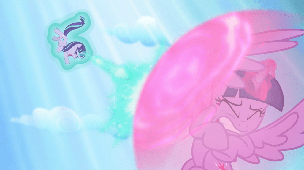 Back in the present, Twilight Sparkle confronts Starlight Glimmer about what she’s been doing, and they exchange beam attacks as they argue.