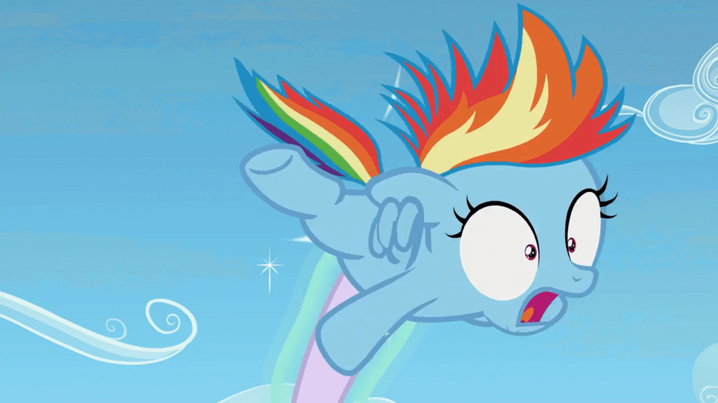 Rainbow Dash never lives this mishap down and spends the rest of flight camp picked on for it. She lives life as a petty, grumbling underdog and never surpasses the flight capabilities of the beloved future Wonderbolt, Lightning Dust. She starts doing skeevy things to reclaim her good name, making a bigger fool of herself each time.