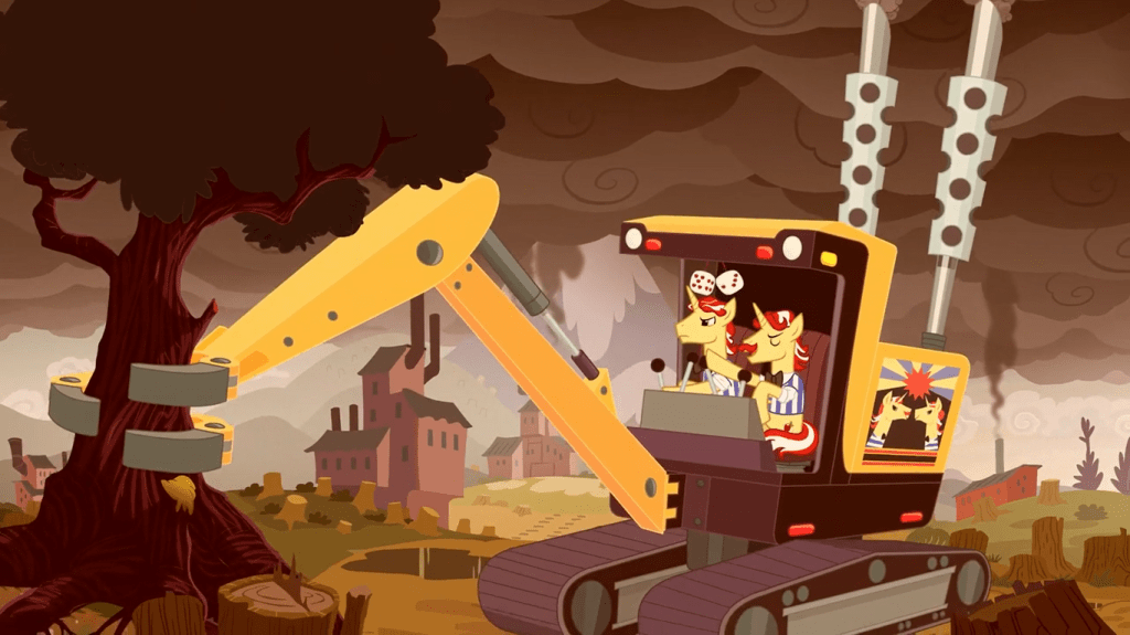 In this timeline, the Mane 6 once again didn’t become friends—none of them moved outside of their original homes, meaning Applejack and Rarity became friends but the rest didn’t. When the Flim Flam brothers challenged the Apples to a cider-making competition, they won fair and square and drove the Apple family out of business. They then became so rich that they could do whatever they wanted to the world, which is unfortunately a lot like what humans have done to Earth in reality.