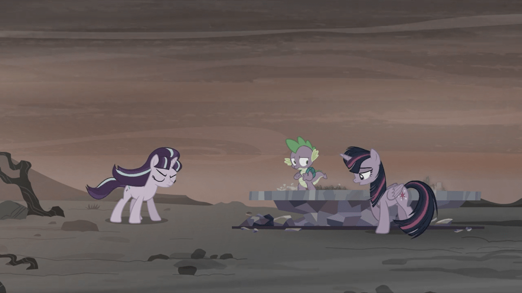 … and the final timeline is the biggest shocker of all. Equestria has been reduced to a barren wasteland where everyone, and I do mean EVERYONE, is dead. It makes a perfect backdrop for Twilight and Starlight’s final confrontation, because it shows the extreme effects of Starlight’s thirst for revenge and the importance of the Mane 6’s teamwork. It’s difficult to imagine how this timeline came to be, but I’ll try anyway.