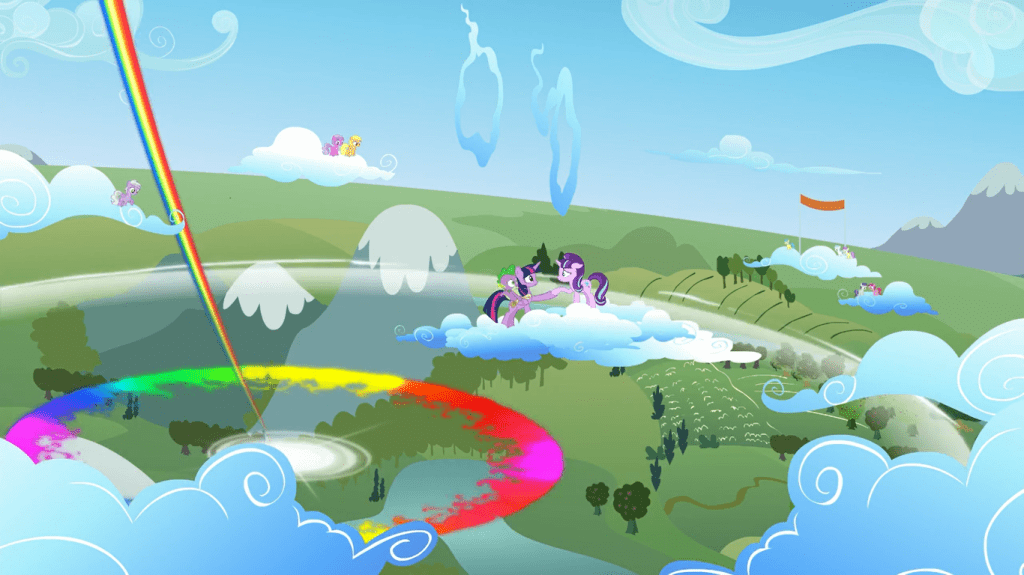 I really enjoy all the creative ways Starlight Glimmer stops Rainbow Dash’s sonic rainboom from happening. The first time, she freezes Rainbow Dash right when her rainboom is about to start. I assume Starlight did it at the last second so that Rainbow Dash would be as embarrassed as possible when a sports bully wins the race instead.