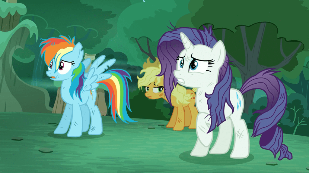 I can see why Rarity departed Ponyville so quickly in this timeline. Since Applejack stayed in Manehattan longer here than in the usual timeline, Rarity got to hear lots of stories about the glamour and sophistication of the city. Since Ponyville’s economy was falling apart due to Applejack’s absence from Sweet Apple Acres, Rarity decided she couldn’t make it as a fashion designer here and thus set out for Manehattan. And since Manehattan is a tough place to make friends in even in the good timeline, friendship was the last thing on Rarity’s mind when she left for the big city.
