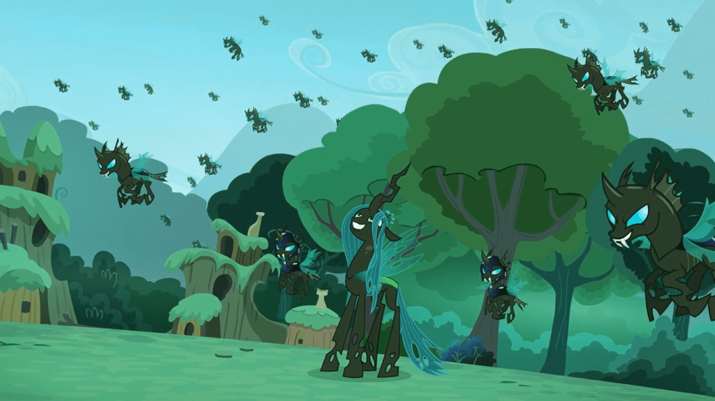 - I find it unsurprising that Bon Bon is in the village of ponies who hid from the changelings. She’s masterful at looking unassuming, and probably managed to spy on some of the changelings’ meetings. Maybe she also wants revenge for the capture or murder of Lyra.