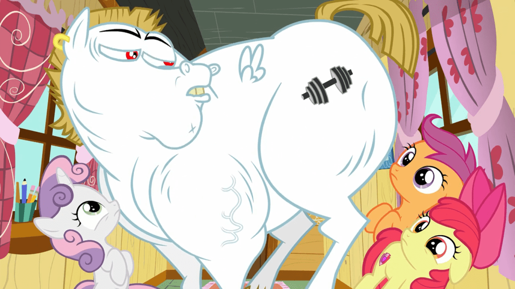 The Crusaders’ first cutie mark problem is incredibly silly: Bulk Biceps has lifted every dumbbell in Ponyville and doesn’t know what to do, so the Crusaders tell him to try lifting other things, then to teach others how to lift if he runs out of things to lift. Pretty straightforward, right? Apple Bloom thinks this was too easy.