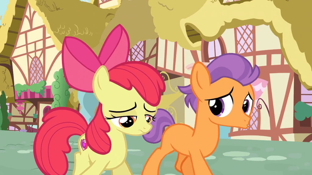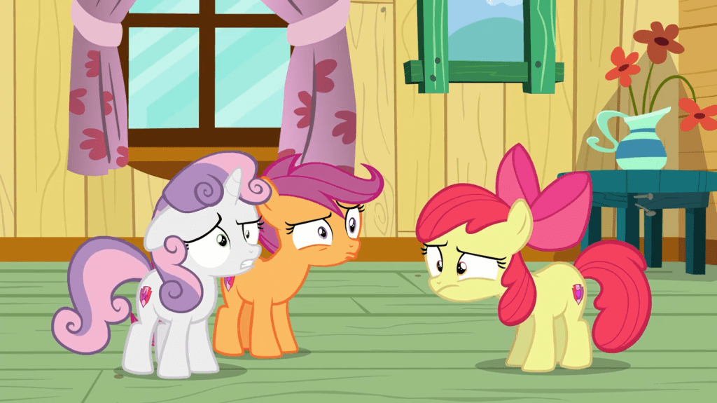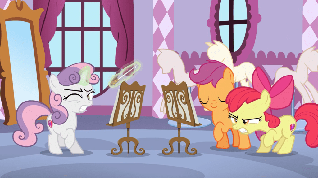 I am noticing some parallels between Apple Bloom and Twilight Sparkle, the leaders of their respective friend groups. Apple Bloom is going into a Twilight-esque slippery slope while barely letting her friends talk, concluding in something as extreme as her friend group no longer existing. While Sweetie Belle and Scootaloo were already friends for a long time, Apple Bloom is the newest addition to the friend group, just like Twilight is. These similarities are a natural result of their leadership roles, but there’s also a little bit of Twilight in Sweetie Belle.