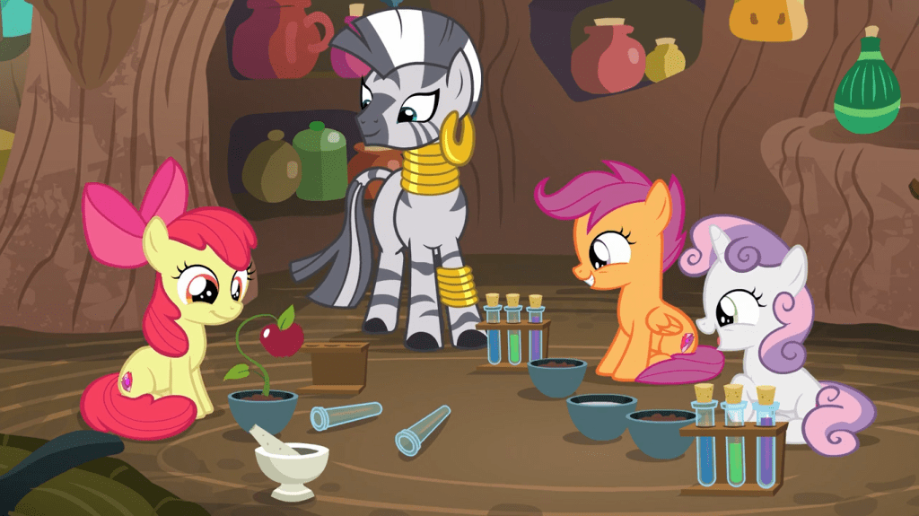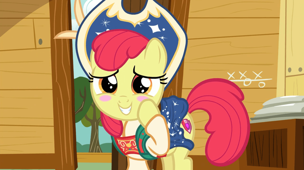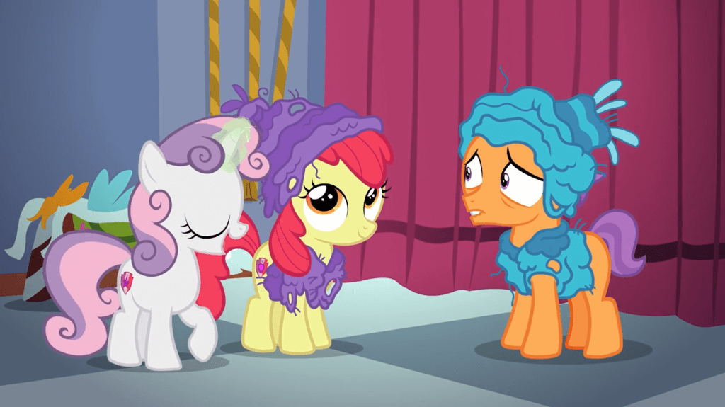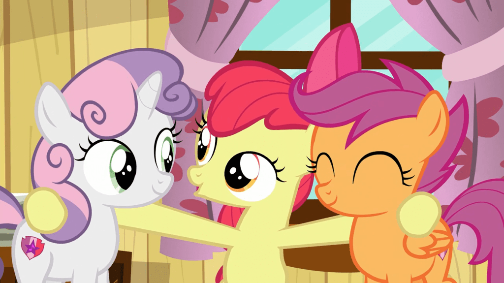 The intro of this episode reminds us that even after earning their marks, the Cutie Mark Crusaders are still a bunch of goofy kids. Apple Bloom starts a club meeting, but Sweetie Belle and Scootaloo are distracted admiring their cutie marks, much like a kid who won a chess tournament staring at their trophy, or someone watching in glee as their newly popular video’s views surpass a million.