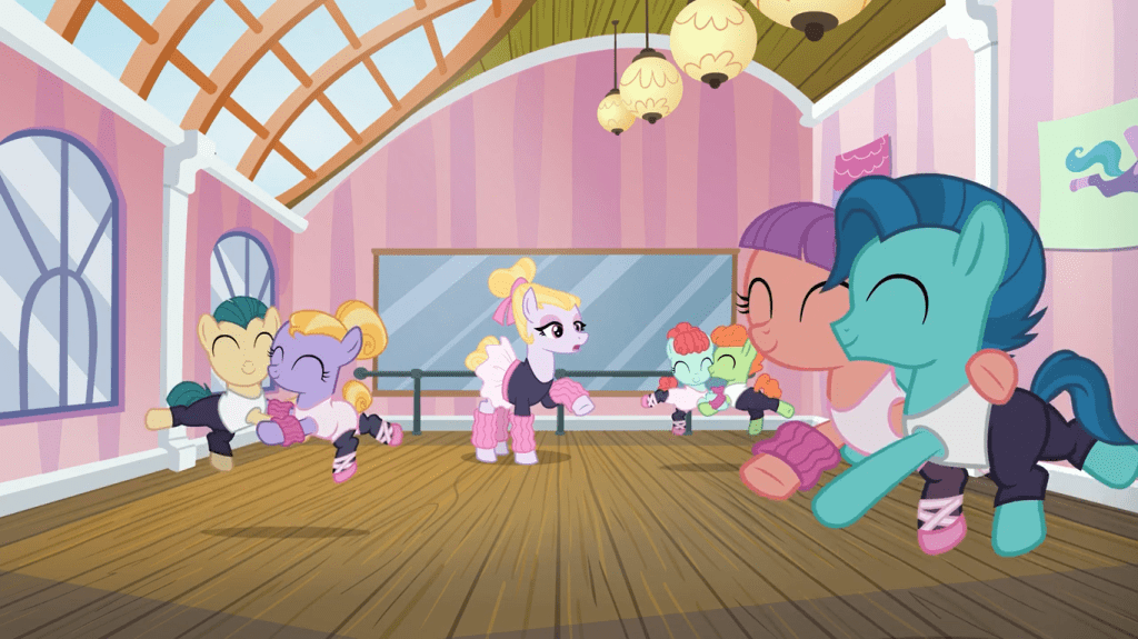 And now it’s Tender Taps’ turn to dance. Though nervous at first, he overcomes his stage fright as he gets in the zone and shows off his skills. This is a new level of accomplishment for the Cutie Mark Crusaders: while they’ve helped several ponies understand their cutie marks, now for the first time, they helped a pony earn his cutie mark. I admire that the show figured out a new role for the Crusaders to play together after earning their marks, rather than withholding their marks throughout the show’s course, which is what I worried would happen back in season 4.