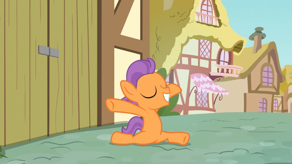In case you thought the initial indications (calling them “hints” is a stretch) of the Crusaders’ individual special talents from season 1 were forgotten about, Scootaloo proves otherwise by perfectly demonstrating one of her scooting techniques and getting annoyed when her two friends aren’t nearly as competent.